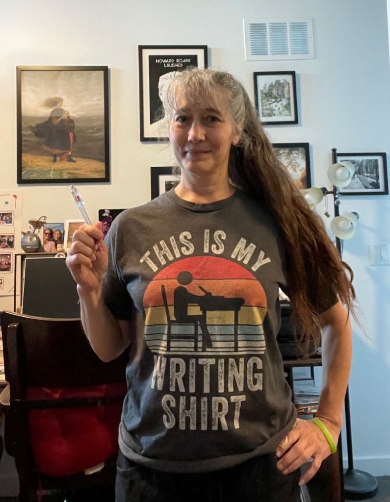 This is my writing shirt, courtesy of Mom. (Photo by Carrie-Ann Biondi, January 2026)